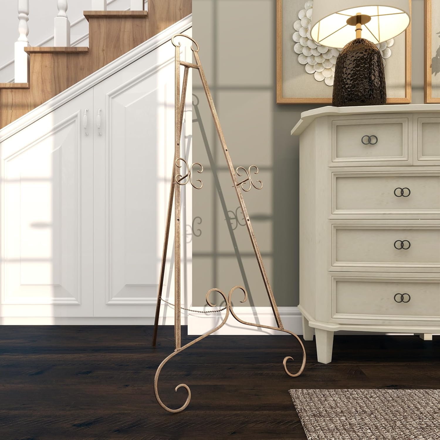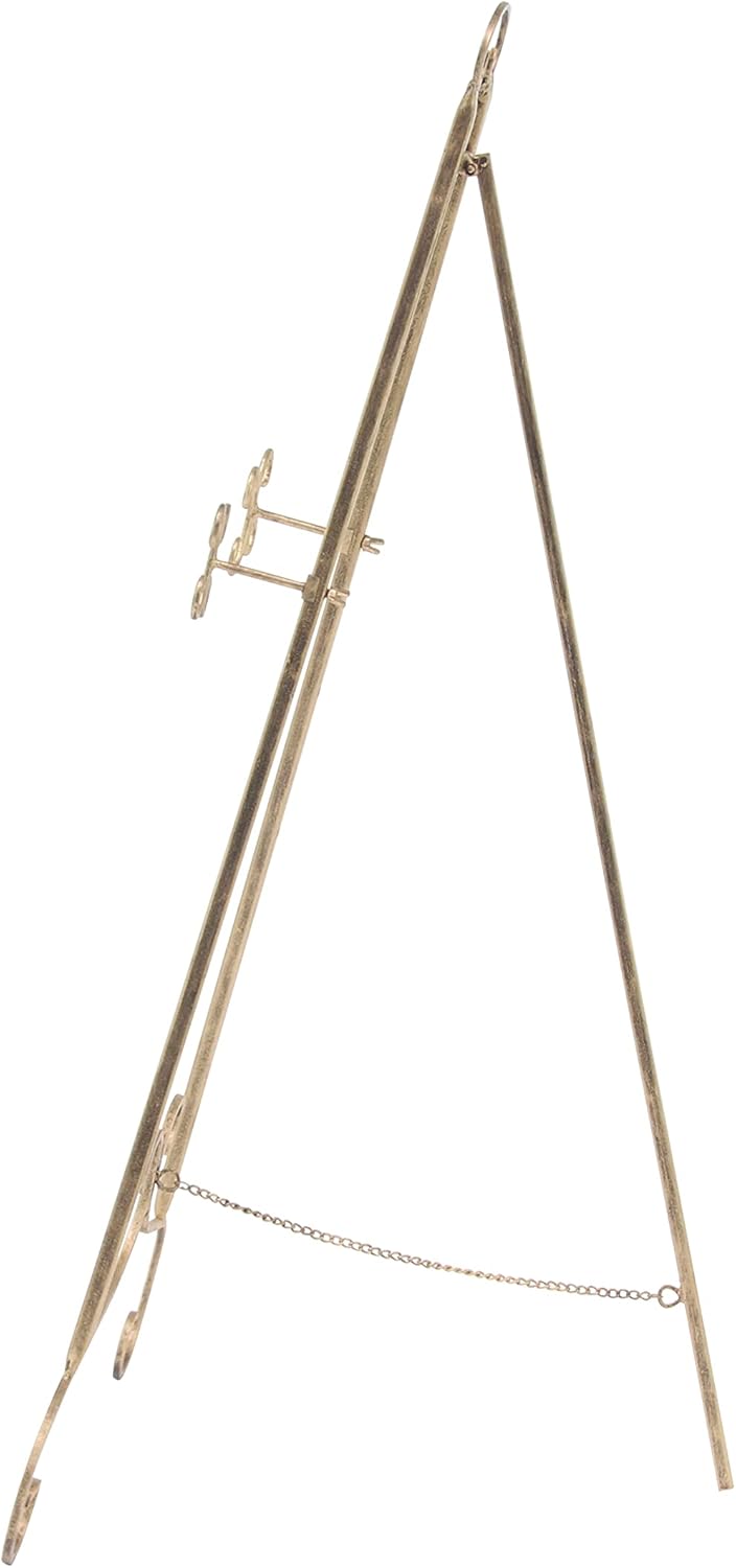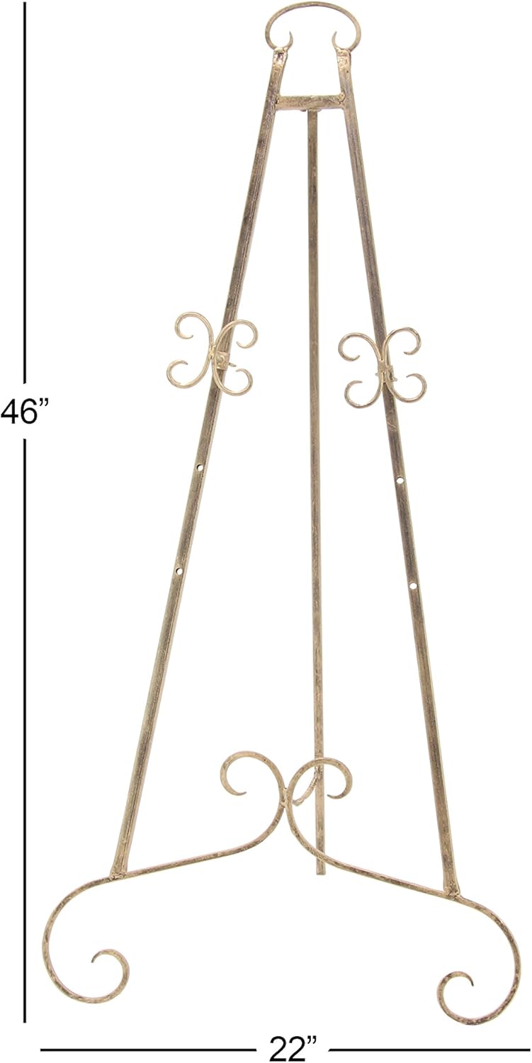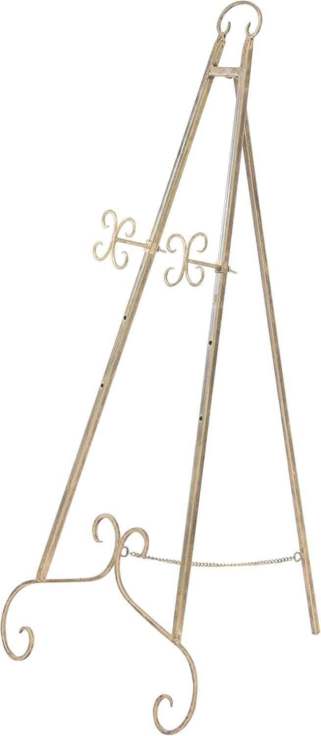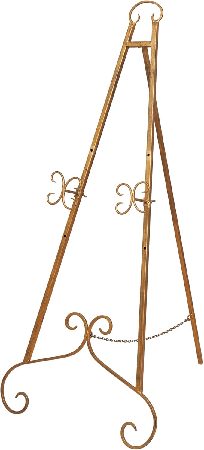 Introducing the Deco 79 Metal Scroll Large Free Standing Adjustable Display Stand Easel with Chain Support in elegant gold finish! This exquisite display stand is designed to elevate your art pieces, picture frames, or decorative plates with sophistication and style.